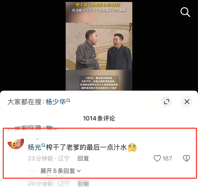 在评论区中,有网友直呼:“杨光榨干了老爹最后一滴汁水!”